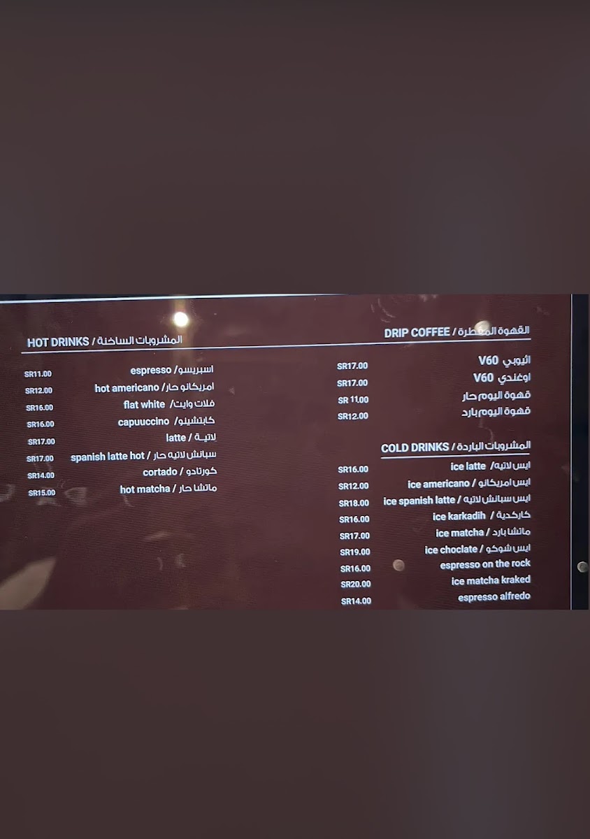 The menu is a carefully curated selection of coffee and sweets, each crafted to ensure quality and flavor. On warmer days, indulge in their Ice Black Coffee or the lighter, refreshing Ice V60, both priced affordably at SAR 4.00 and SAR 1.00 respectively. For those with a sweet tooth, the Madrid Cheese cake is a must-try at SAR 32.00; it features a delicate texture that melts in your mouth, harmonizing beautifully with the rich flavors of their expertly brewed coffee. Don’t miss out on the Nooi Cake Signature and the Caramel Chocolate, each showcasing the café’s dedication to high-quality ingredients and masterful baking.
